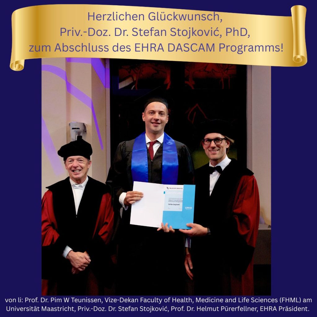Dr. Stojkovic erhielt sein Diplom persönlich vom EHRA-Präsidenten, Prof. Dr. Helmut Pürerfellner, und geht als erster DASCAM-Alumni der Medizinischen Universität Wien in die Geschichte ein.